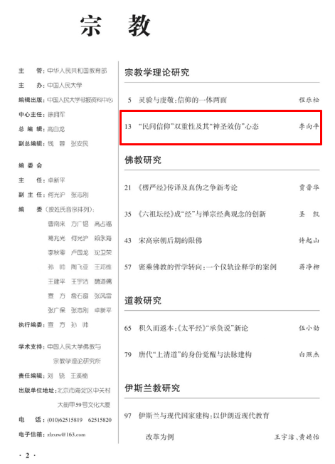 李向平教授的题为《“民间信仰”双重性及其“神圣效仿”心态》的高质量论文。本文系国家社会科学基金重大项目“中国特色宗教社会学话语体系及其本土知识结构研究”(编号:18ZDA230)的阶段性成果。